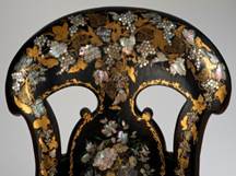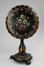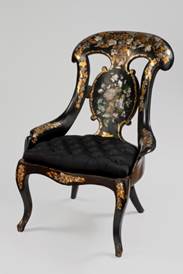 Fig. 4: Gueridon and armchair, partially in papier-mâché, with mother of pearl incrustations. English or French, c. 1850.