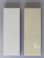 Fig. 3: Two mock-up samples in two different stages of production. Left, a mock-up sample with a white lead white ground layer before varnish application. Right, after application of 6 layers varnish of the Stalker and Parkers' recipe 'To make the best White-varnish’.