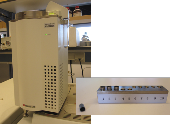 Figure 2. Frontier Lab Multi-Shot Pyrolyzer (EGA/PY-3030D) equipped with Auto-Shot Sampler (AS-1020ET) to handle a large number of samples (left); deactivated stainless steel Eco-cups are used to hold the sample during pyrolysis (right).