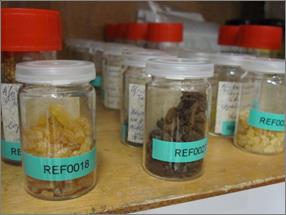 The resin reference samples (figure 3) are also used to build a Py-GCMS mass spectra reference database that will facilitate the identification of natural resins present in European lacquers. The pyrogram of each reference resin will be carefully scanned for (unique) biomarkers, which will be stored in a Py-GCMS reference database. As natural resins can change drastically in chemical composition upon ageing, biomarkers of aged resins are needed. For that purpose single resin varnishes, applied as thin films on glass slides, will be prepared by the University of Antwerp. Once dried, the samples will undergo artificial ageing in an Atlas weatherometer under controlled conditions of temperature, relative humidity and light intensity and wavelength range. By taking regularly samples, the ageing process van be followed in time, and the chemical changes in composition monitored. At the end aged resins containing (unique?) biomarkers are obtained, which will be fed to the Py-GCMS database, which in turn will facilitate the identification of the natural resins in the European lacquers. As the screening of a pyrogram takes much time, efforts will be done by using AMDIS (Automated Mass Spectral Deconvolution and Identification System) to (partially) automate the identification process.