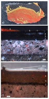 Figure 5. a) Detached sample with European lacquer from an object of the collection of the RMAH of which a small part at the intersection between the black and red lacquer was used to prepare the cross-section b) Detail of the cross-section under white light, showing a tinted thick ground layer (1), followed by a few dark coloured lacquer layers (2-4), a red lacquer layer (5) and gold foil (6) c) Another detail of the same cross-section, but under UV-light, showing clearly two final transparent lacquer layers (7-8) and a wax layer.