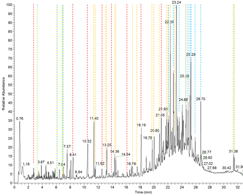 Figure 6. Typical Py-GCMS pyrogram of a European lacquer sample. Each peak in the pyrogram corresponds to a certain chemical compound. All peaks indicated with a dashed line of the same colour point to chemical compounds originating from the same resin. In this sample at least 5 different ingredients in the European lacquer can be noticed.